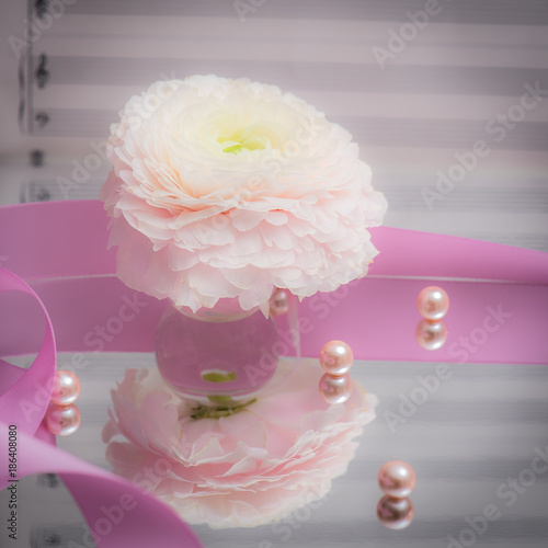 Beautiful Pink Rose In A Small Glass Vase Put On A Mirror With Pink Pearls And Note Paper In Background Stock Photo Adobe Stock