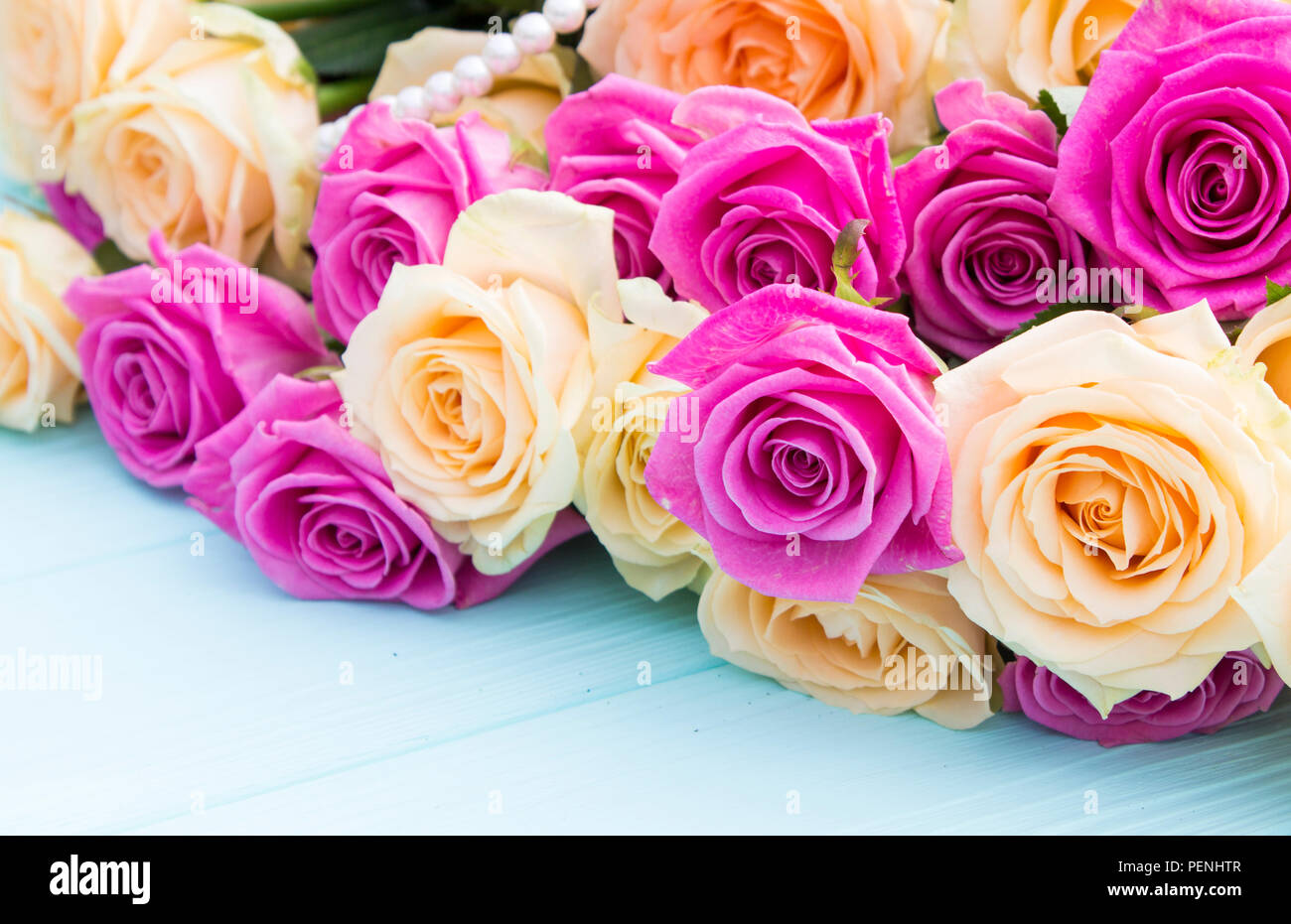 Beautiful Roses On A Turquoise Blue Background Roses And Pearls On A Wooden Background Stock Photo Alamy