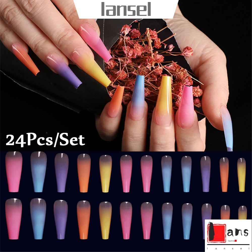 Lansel 24pcs Set Fake Extension Tips False Nails Acrylic Gradient Color Long Coffin Fake Nails Manicure Ballerina Beauty Tools Full Cover Press On Nails Rainbow Nails Shopee Singapore